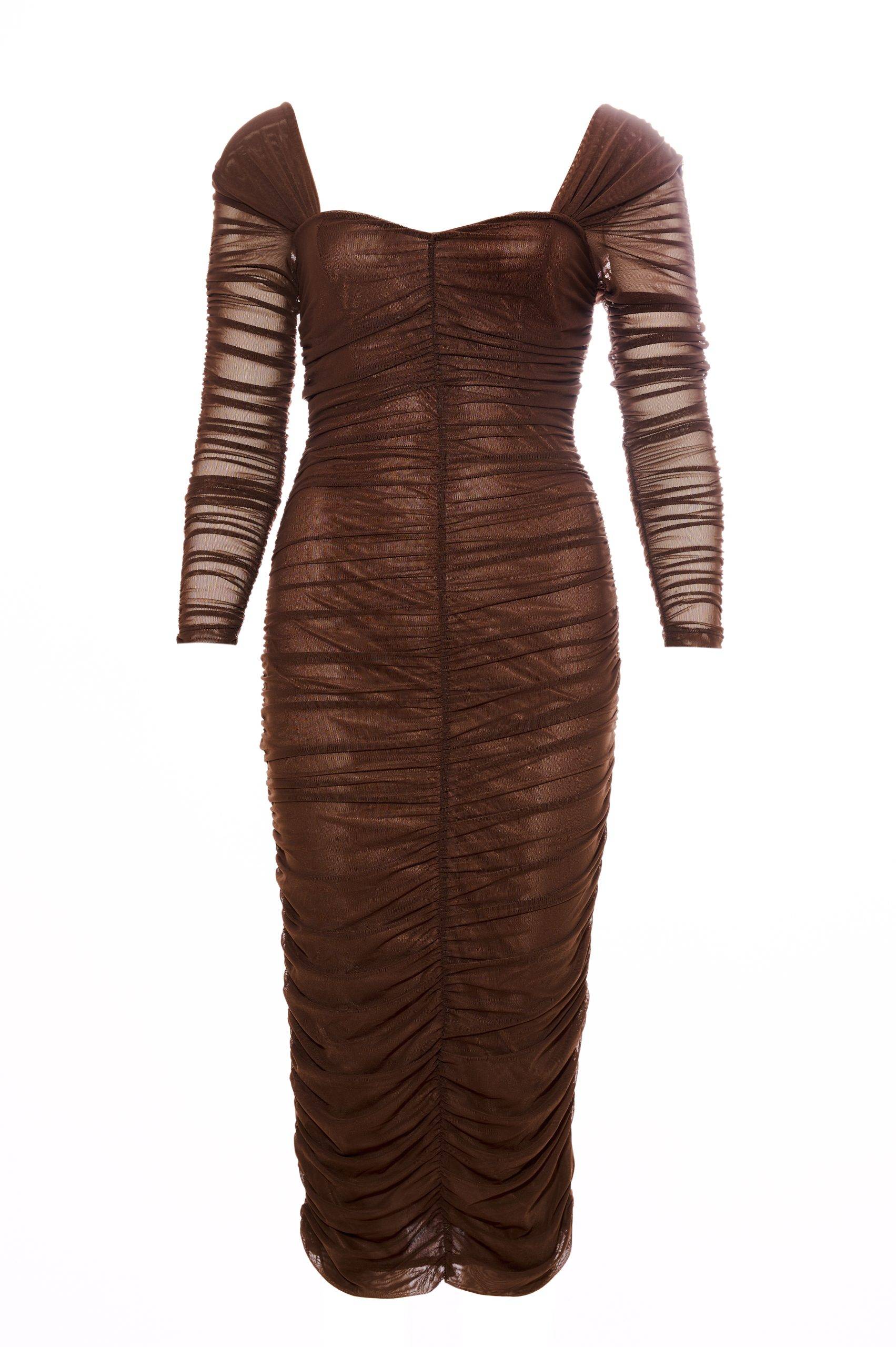 Το Choco Midi Mesh Dress είναι ένα εφαρμοστό γυναικείο φόρεμα από ελαστικό τούλι, σε σοκολατί απόχρωση. Το μήκος μέχρι τη μέση της γάμπας και η απαλή εφαρμογή του αναδεικνύουν τη σιλουέτα, ενώ η εσωτερική φόδρα προσφέρει άνεση και σταθερότητα. Ένα κομμάτι με διακριτή κομψότητα, ιδανικό για ιδιαίτερες εμφανίσεις.